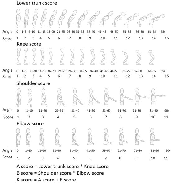 - Beltran Martinez, K.; Nazarahari, M.; Rouhani, H. K-Score: A Novel Scoring System to Quantify Fatigue-Related Ergonomic Risk Based on Joint Angle Measurements via Wearable Inertial Measurement Units. Appl. Ergon. 2022, 102, 103757. [Google Scholar] [CrossRef] [PubMed]