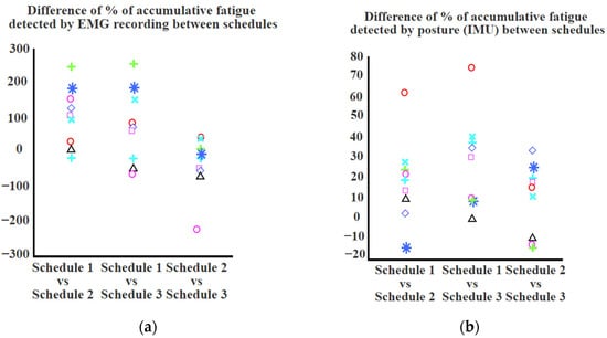 Difference of muscle fatigue detected between Schedule 1 and Schedule 2 and between Schedule 1 and Schedule 3 for all participants measured with (a) EMG amplitude and (b) Body posture. The results for each participant are shown with a unique symbol and/or color.