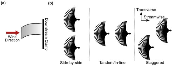 Recently, the concurrent operation of two or more inverted flags has started to gain attention, with two main configurations being considered: side-by-side (see Figure 1b) [45,46,47,48,49,50,51] and tandem (see Figure 1b) [51,52,53] configurations within the horizontal plane. Huertas-Cerdeira et al. [45] experimentally studied the dynamic response of side-by-side inverted flags, with a transverse distance larger than double the length of the flag, demonstrating that the maximum angular amplitude is 36% higher than that of a single flag. Hu et al. [50] attributed this increase to the flapping promotion resulting from the leading-edge vortex (LEV) behind the adjacent flag. On the other hand, Huang et al. [52] investigated the tandem configuration and found through numerical simulations that a destructive vortex merging reduces the flapping amplitude of the downstream inverted flag by 50% compared to a single flag. However, using an experimental approach, Hu et al. [53] demonstrated that the downstream inverted flag can extract energy from the trailing edge vortex of the upstream flag at a critical flow velocity and a short streamwise distance, leading to increased angular amplitude of the downstream flag. This finding was found to be consistent with the behavior of tandem conventional flags observed by Jia and Yin [54] and Ristroph and Zhang [55].