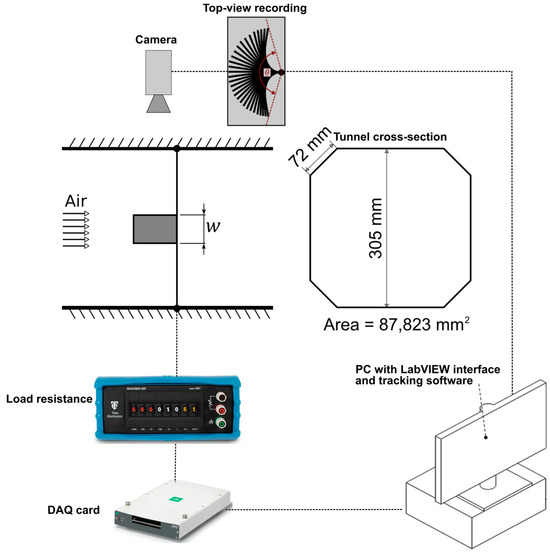 Figure 3 shows a schematic of the experimental set-up used to characterize flag dynamics of the inverted flags, as well as the power generation characteristics in the case of the harvester flags. The trailing edge of the flag(s) was/were clamped and attached to a vertical pole located midway through the wind tunnel (wind tunnel manufactured by Armfield Ltd., Ringwood, UK (www.armfieldonline.com, accessed on 1 October 2023)). The wind tunnel had an octagonal cross-section with dimensions shown in Figure 3. The free-stream airflow was characterized using a calibrated hotwire anemometer before any tests were conducted, and the turbulence intensity was found to be around 0.6% within the airflow velocity range between 1.5 and 30 m·s−1, relevant to this study. The boundary layer thickness was within 5 mm, and the velocity profile (excluding the boundary layer) was uniform to within 1%. These conditions ensured that the tested flags were always exposed to a fully developed velocity profile during the tests. The average airflow velocity in the wind tunnel was measured using static/dynamic pressure ports connected to a calibrated pressure transducer from Sensirion AG, Stafa, Switzerland (model SDP816; www.sensirion.com, accessed on 1 October 2023) with ±5% error. The ambient conditions during testing were consistently around (298 ± 1) K and (101 ± 1) kPa.