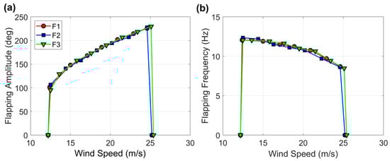 (a) Flapping amplitude and (b) flapping frequency for baseline flags F1, F2, and F3 in typical configuration, as shown in Figure 3.