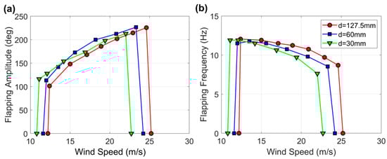 The next set of experiments, where flag F1 was tested at different distances from the wall of the wind tunnel (first configuration in Figure 4), are documented in Figure 6. As the flag approached the wall, the wind speed range of flapping gradually shrank and shifted towards lower velocities, from 12.2 to 25.2 m·s−1 when the flag was placed in the middle of the wind tunnel, to 10.8 to 22.7 m·s−1 when the flag was placed at = 30 mm from the wind tunnel wall. Moreover, it is evident that, for a given wind speed, the flapping amplitude generally increases due to wall proximity, whereas the flapping frequency decreases in proportion to the wind speed; the higher the windspeed, the more pronounced the reduction.