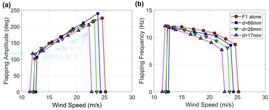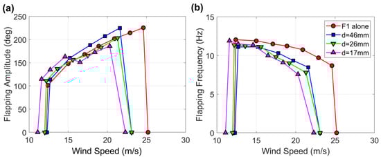 (a) Flapping amplitude and (b) flapping frequency for the baseline flag F1 while being approached by two other flags (third configuration in Figure 4). The measurements for flag F1 alone in the middle of the wind tunnel are also included for comparison.