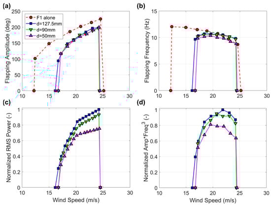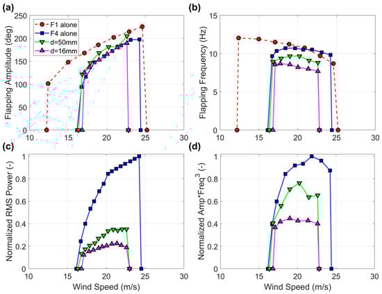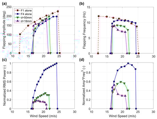 (a) Flapping amplitude, (b) flapping frequency, (c) normalized RMS power, and (d) normalized product of flapping amplitude times the cube of the flapping frequency for harvester flag F4 while being approached by two other flags (third configuration in Figure 4). Baseline flag F1 included for comparison in panels (a,b).