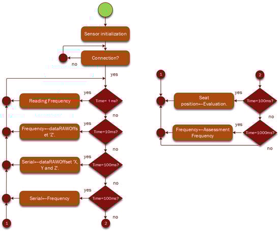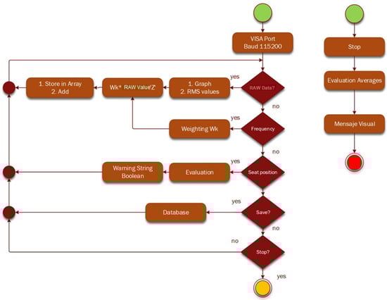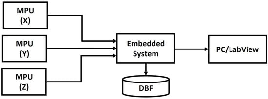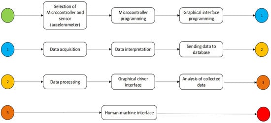 Figure 2 shows the logic diagram for the acquisition of vibration data from the driver’s seat using discrete IoT devices [,], and Figure 3 defines the diagram of the data acquisition process of the test prototype.