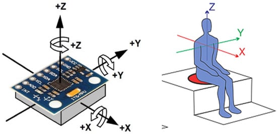 In the LabVIEW development environment, the data acquisition was programmed to send an identifier from the embedded system, plotting the three acceleration signals in their X-, Y-, and Z-axes across different graphs within a single cycle. Four Waveform Chart graphs were placed in the LabVIEW graphical interface to visualize the acquired data on the three axes as a function of time [,]. The layout of the axes, according to the positioning of the sensor in reference to ISO-2631 [], is shown in Figure 4.