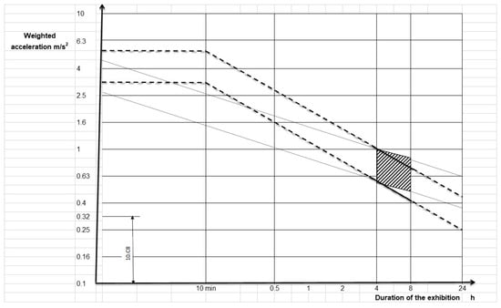 For health risk assessment, ISO 2631-1:1997 [] provides the graph shown in Figure 9, which represents the permissible limits with respect to driving time exposure.