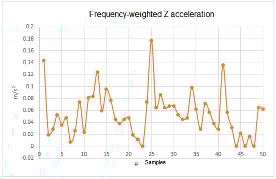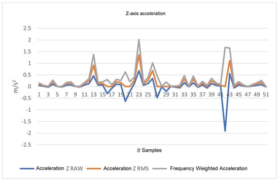As can be seen in Figure 15, the three lines represent the acceleration according to the type of processing being carried out. The blue line represents the acceleration in m/s with the direct values from the accelerometer. The orange line represents RMS data, and, finally, the frequency-weighted acceleration data are represented in the gray color. These data are obtained according to the arrangement described above, obtaining the frequency ratio and the factor.