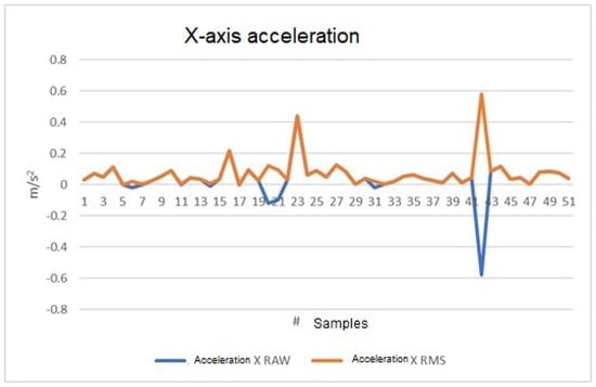 In Figure 13, Figure 14 and Figure 15, we plot acceleration on the three axes. The blue line (RAW values) shows an increase when the vehicle accelerates and a decrease when it decelerates, explaining the negative values. Conversely, the orange line (RMS values) always displays positive values, as RMS values are calculated by taking the square root of the mean of the squares of the acceleration values, and are always positive by definition. Therefore, when the vehicle decelerates, the plot of both values (RAW and RMS) will show discrepancies, indicating that the RMS plot does not consider whether the vehicle is accelerating or not, only the energy or intensity of the acceleration. This also explains why the orange value at those points is not equivalent to simply removing the sign of the signal. Figure 13 and Figure 15 show more discrepancies, indicating frequent acceleration and deceleration in the X- and Z-axes, which is expected as they reflect the car’s forward movement or stopping, and vibrations, respectively. Figure 14 appears less discrepant, aligning with the observation that there are virtually no sudden changes in acceleration from the driver’s left or right side (the Y-axis).