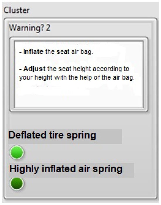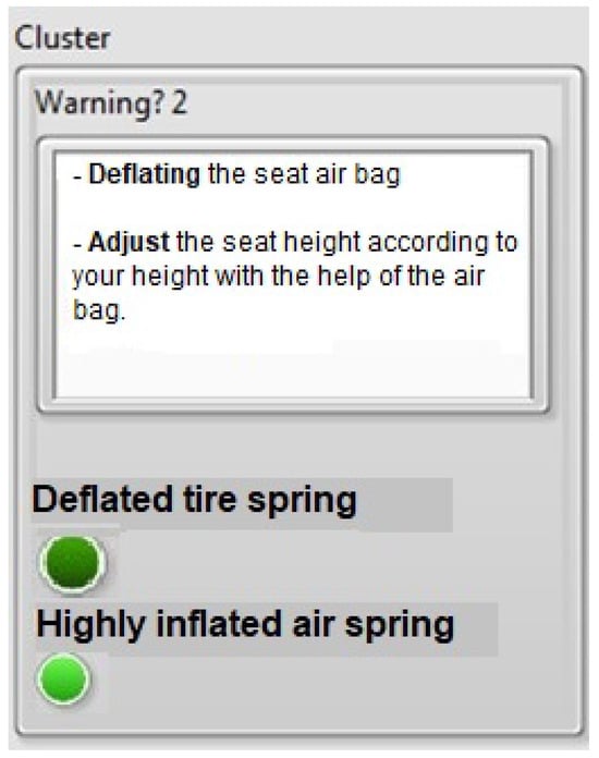 The graphical interface, operating in real time, will inform the driver about the state of the air spring. Some authors have suggested that air springs have two positions in which mechanical vibration is not attenuated: the lower and upper positions. Therefore, the graphical interface will give two warnings to the driver and suggest avoiding these two states of the seat.