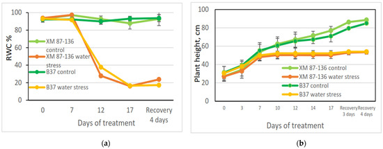 Changes in leaf RWC (a) and plant growth (b) of inbred maize B37 and XM 87-136 during drought stress and recovery. Data are presented as the mean values ± standard deviation. (a) Relative water content (RWC) of tested maize lines; (b) plant growth of tested maize lines.