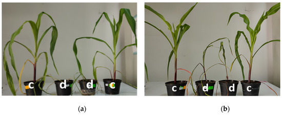 Phenotype response of inbred maize line B37 and XM 87-136 on the 17th day of drought stress treatment. c—control plants; d—maize plants on the 17th day of drought stress. (a) B37—day 17; (b) XM 87-136—day 17.