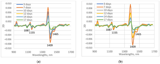 Average second derivative of maize leaf spectra, measured from 3 to 17 days of drought, are shown in Figure 4 for both investigated maize lines. Absorption patterns of the two maize inbred lines were very similar. The spectra were dominated by the absorption band of water in the first overtone region between 1400 and 1500 nm. The biggest differences in the spectra for both tested maize lines could be observed at 1409 nm, connected with the absorbance of free water molecules. The absorption decreases with increasing the period of water stress. Absorption at approximately 1155 nm is connected with water absorption—a combination of the first overtone of O-H stretching and O-H bending vibration [37]. Absorption of maize leaves at 1087 nm also shows a dependence on drought days.