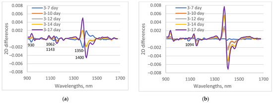 The differences between spectra of maize lines, measured at 3 days of water stress and other days were calculated and presented in Figure 5. The stress responses of the two investigated maize lines now varied. For the drought-tolerant line, there are almost no differences in the spectrum until day 7 of drought. In the case of the B37, there are differences between the 7th and the 3rd day of water stress, especially at 930 nm, and the region 1350–1400 nm. The absorption at approximately 930 nm suggesting bond with either the C-H or O-H group. According to Rajkumar et al. [50], absorption at 930–935 nm is connected with O-H stretch (water solvation shell). The changes in the absorption in the area 1350–1400 nm are connected with weakly hydrogen-bonded water and trapped water or water vapor. This may indicate a loss of moisture through transpiration or a different content of trapped water, which is more significant for B37 plants [38,46]. Therefore, B37 plants undergo some physiological changes at the beginning of water stress that are different from those of XM 87–135 plants. These changes have not yet affected the physiological data at day 7 of drought, but have altered the spectral characteristics measured for B37 plants. Additionally, differences were observed in the area from 1062 to 1143 nm, mainly due to O-H and C-H vibrations [51]. This showed some differences in the processes of water stress between the two maize inbreds.