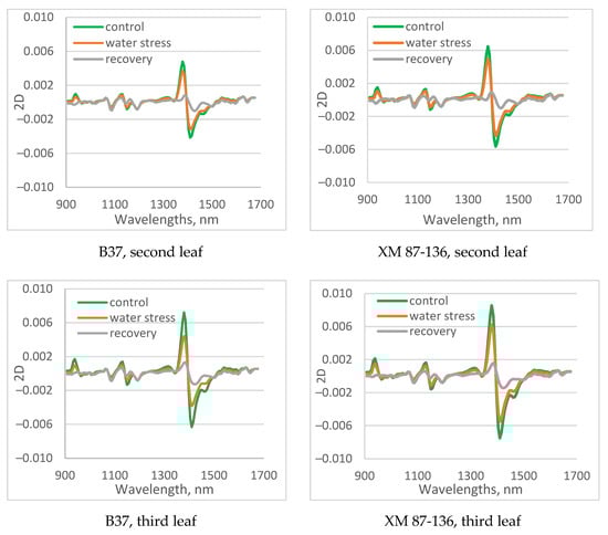 The second derivatives of average maize leaf spectra of control, water-stressed, and recovery plants are presented in Figure 6. There were clear differences among spectra of control, water-stressed, and recovered maize leaves for both investigated inbred lines.
