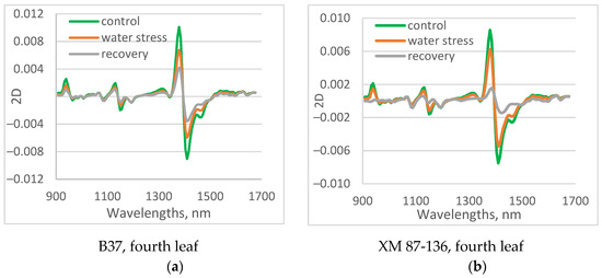 Average second derivative spectra (2D) of leaves of B37 and XM 87-136 maize lines in process of water stress. (a) B37; (b) XM 87-136.