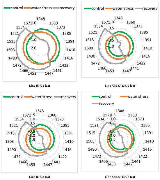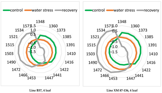 The character of the aquagrams for days 3 and 7 for B37 plants was different compared to those for the line XM 87-136. This confirms the observed differences in early drought processes between the two maize lines. They are especially significant in the range 1409–1453 nm. The water absorption at 1441 and 1447 nm is important in desiccation processes and abiotic stress [35,42].