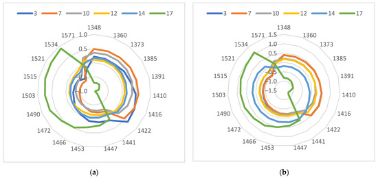 For further investigation of changes in leaves during water stress, aquagrams were calculated for different drought days (Figure 8). There is a smooth decrease in the values of the aquagram coefficients in the range of 1347–1442 nm for XM 87-136 water-stressed plants. The values for days 3 and 7 are very close, as are those for days 10 and 12. The values for days 3 to 10 in the 1440–1533 nm range are quite close. Very different from the others is the aquagram obtained for the leaves of the plants on day 17 of the water stress.
