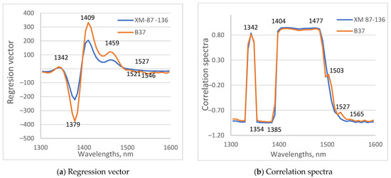 Regression vectors and correlation spectra from PLS procedures were investigated to find important wavelengths for the determination of days of drought. A regression vector plot is a line plot of coefficients in the model versus wavelengths. The correlation spectrum shows a correlation between the determined parameter and spectral information. Both models for B37 and XM 87-136 provided similar regression vectors and correlation spectra (Figure 10). The most influential variables were at 1342, 1379, 1409 and approximately 930 1459 nm, which are close to WAMAC coordinates C1, C4, C5, and C9, respectively. In the area 1350–1500 nm, there was only a difference in the magnitude of regression vector coefficients. They were bigger for B37 compared to those for the XM 87-136 line. This is related to the difference in absorption values for the two types of maize plants. Small differences existed at 1521, 1527, and 1546 nm. The differences in correlation spectra were most significant in the region 1500–1600 nm, similar to the result of regression vectors. They appear at 1503 and 1527 nm in the correlation spectra of the model for the B37 line. Absorption at 1503 nm can be associated with strongly bound water. In previous investigations absorption at 1527 nm is connected with structural–water and water–cellulose interactions [57].