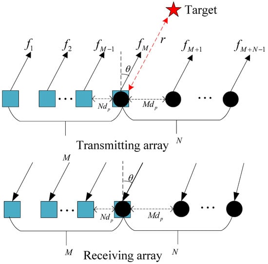 A frequency-diverse array multiple-input–multiple-output (FDA-MIMO) radar is a nascent radar system that integrates frequency-diverse array and multiple-input–multiple-output technologies. The system introduces tiny frequency increments to generate range–angle-correlated transmission beams, which enable highly accurate and interference-resistant joint estimation of the range and angle of the target. Originally proposed by USA (United States of America) researchers in 2006 [] and further developed by UK (United Kingdom) researchers in 2013 [], the technique has a wide range of applications in aerospace, autonomous driving, IoT (Internet of Things), smart cities, and wireless communications to improve efficiency, security, and user experience [,,,,]. An unfolded coprime array (UCA) with unfolded coprime frequency offset (UCFO) was proposed by researchers in 2022 []. Both the transmitter and receiver used a sparse uniform linear array (ULA) [,]. The signal was expanded by using negatively and positively biased portions of the transmitted signal by the framework. This increased signal bandwidth and array aperture and improved parameter estimation.