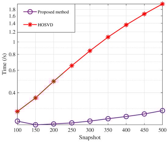 In the second experiment, we configure SNR = 10 dB and examine how the algorithm execution time changes with the snapshot number. Figure 3 shows the factor matrix time cost for the core tensor and parameter estimation using HOOI and conventional HOSVD, respectively. Since the signal model in this paper allows HOOI to reach the termination condition at an iteration number of 1, whereas HOSVD requires singular-value decomposition of all modes, the running time of HOOI is much smaller than that of HOSVD.