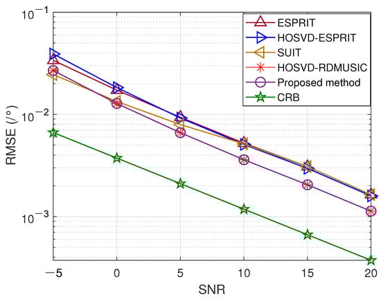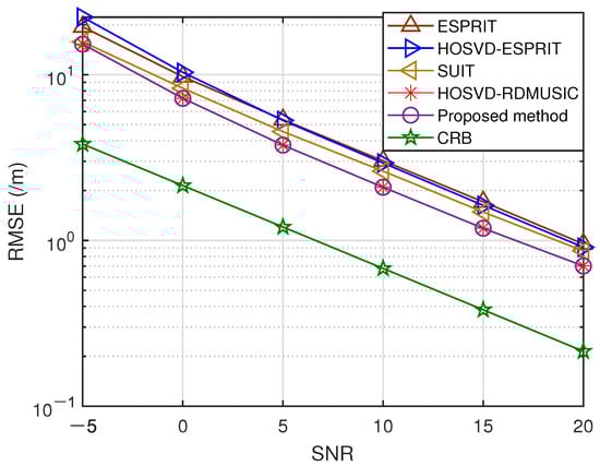 In the third experiment, we assess the effectiveness of the previously mentioned methods using different signal-to-noise ratios while . The RMSEs for range and DOA are shown in Figure 4 and Figure 5, respectively. Our results indicate that the proposed method exhibits exceptional accuracy and stability, outperforming all other methods, including conventional HOSVD-RDMUSIC. This results from our presented method’s application of a multidimensional structure by tensors, which boosts the precision of target localization.