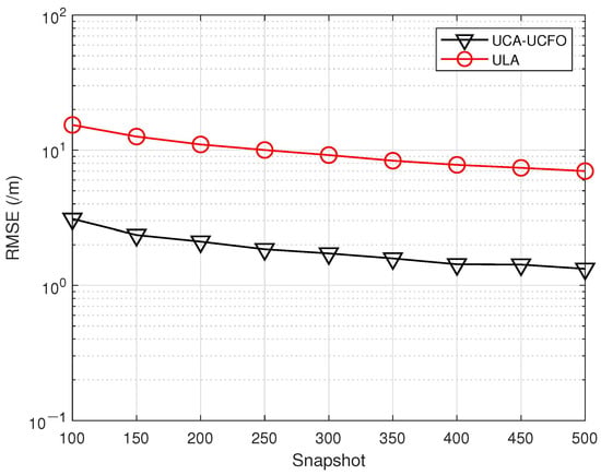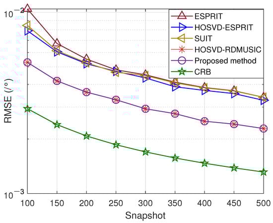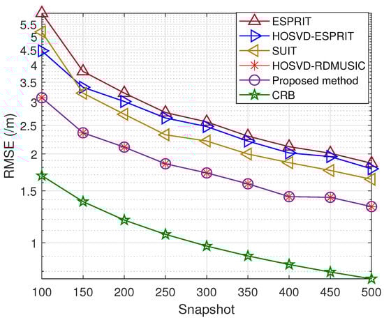 In the fourth trial, Figure 6 and Figure 7 illustrate the DOA and range estimation RMSE obtained by the previously mentioned methods under different snapshot conditions at an SNR of 10 dB. Similarly, we also present the comparison method. It is clear that the curve of the RMSE for the suggested method is nearer to the Cramér–Rao Bound (CRB).
