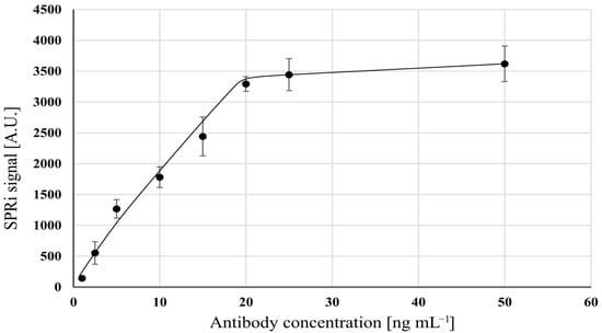 The concentration of antibody solution determines the number of active points of the biosensor and should correspond to the expected FSH concentration range. Optimization experiments were performed in a PBS buffer (pH 7.4) at a constant FSH activity (31.5 mIU mL−1). In a series of experiments, biosensors were formed using different concentrations of a mouse monoclonal anti-FSH antibody. These biosensors were tested at a constant FSH activity. The results are shown in Figure 1. Increasing the antibody concentration up to 20 ng mL−1 caused an increase in the SPRi signal, but above that level, there was no further rise in the SPRi signal. This is due to saturation of the active points on the biosensor surface. Therefore, a concentration of 20 ng mL−1 of antibody was selected as the optimal value for further experiments. The limit of detection (LOD) in this experiment was calculated by formula 3.3 SD/A (A- slope of the calibration curve) and it was 0.905 ng/mL.