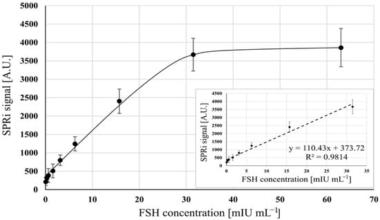 The SPR immunoassay method in the classic version was used to detect FSH []. SPR measurements in a flow system were performed. A commercial SPR biosensor was employed for SPR measurements. A binding inhibition immunoassay format was used for the detection of FSH. The hormone was covalently attached to the sensor surface using amino coupling between a carboxyl group end in the SAM (self-assembled monolayer) and amino groups in the protein. For this FSH assay, the detection limit obtained had a higher value (LOD = 29 mIU mL−1) than that of the developed SPRI biosensor. The measurement was performed using the two flow cells. The sample injection volume was 220 µL.
