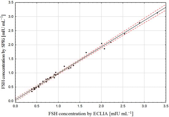 A significant advantage of the developed biosensor is the small sample of blood plasma required for a single measurement. Only 3 µL of plasma is applied to the biosensor. Such small sample volume enables the performance of many different determinations from a single blood sample. Although the experiments with real samples used blood plasma, it is likely that very similar results would be obtained with blood serum. An additional advantage of this biosensor is the possibility of making simultaneous determinations from multiple samples (usually nine). These two factors reduce the cost and time of a single measurement of FSH in blood plasma. Array SPRi biosensors have been successfully used to determine biomolecules not only in blood, but also in urine [,] and saliva [,]. However, the potential application of the developed biosensor in the medical field beyond the determination of FSH concentration in blood plasma requires further research. Such studies may provide information on the cost effectiveness and practicality of using this biosensor in clinical settings.