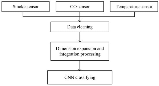 Early fire detection systems have relied on a single temperature sensor or smoke sensor, employing a single threshold for judgment. However, these systems are susceptible to interference and often exhibit low detection accuracy. The corresponding fire detection methods include the threshold method, the trend method [2], the power spectrum algorithm [3], and so on. While these approaches are straightforward to implement, their accuracy is limited. To address these limitations, composite detectors are widely used nowadays [4]. Some scholars collect smoke concentration, temperature, carbon monoxide (CO) concentration, images and other information, and apply information fusion technology to fuse the heterogeneous data of multi-sensors [5,6]. Their detection accuracy is much higher than that of the early systems, and the anti-interference ability is stronger. In addition, the use of wireless sensors [7,8] connected to the Internet enables faster response and wider coverage of the detection system.