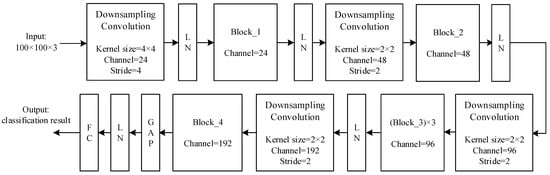 Thanks to the pre-processing stage, the characteristics of time-series information are better represented. Thus, we can further decrease the blocks, channels and layers of the ConvNeXt-T model. Specifically, we keep four stages, like those of [20], but decrease (1) the number of blocks in each stage from (3, 3, 9, 3) in ConvNeXt-T to (1, 1, 3, 1); (2) the number of input channels in each stage from (96, 192, 384, 768) in ConvNeXt-T to (24, 48, 96, 192); and (3) the expansion ratio of the middle hidden layer of the block from 4 in ConvNeXt-T to 2. These reduce the number of convolution calculations so that the computational complexity is greatly decreased.