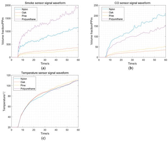 The environmental parameters of fire numerical simulation are as follows: the temperature is 20 degrees Celsius, the relative air humidity is 40%, the air pressure is 1.0132 × 105 Pa, and the oxygen mass fraction is 0.2324. There are four kinds of burners: nylon, oak, pine, and polyurethane. Each experiment lasted for 60 s, and six groups of positive samples could be obtained. Each type of burner was simulated 96 times to obtain ample positive samples. The signals of the sensors with four kinds of burners are shown in Figure 5. The CO and smoke data are calibrated in parts per million of volume fraction, and temperature data are measured in degrees Celsius.
