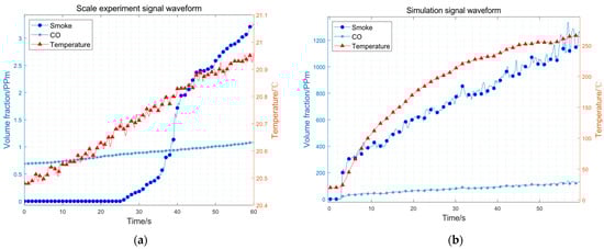 The results of fire numerical simulation: (a) smoke sensor signal waveform; (b) CO sensor signal waveform; (c) temperature sensor signal waveform.