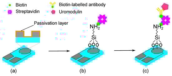 Schematic representation of the sensor concept for uromodulin detection with passivated functionalized IDE: (a) passivated IDE, (b) silanization and biotin–streptavidin immobilization, (c) biotin-labelled antibody immobilization and uromodulin immobilization.