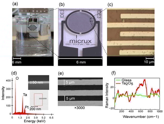 The ALD technique for Ta2O5 deposition offers the advantage of pin-hole free layers, with a high dielectric constant (high-) of 18–25 [,]. The presence of Ta2O5 is confirmed with EDS spectra characterization (Figure 2d), showing the oxygen at weight and atomic percentages 31.1/68.4%, tantalum 32.8/6.4% and platinum 24.1/4.3% as prominent peaks. Small quantities of other elements, like carbon (4.4/12.8%) and silicon (6.3/7.9%), are also seen. SEM characterizes the dimensions of the IDE fingers (Figure 2e) and the thickness of the passivation layer on the sensor. The sensor is also characterized with Raman spectroscopy, showing a clear change before and after passivation (Figure 2f). The spectrum is comparable to that of amorphous Ta2O5 [].