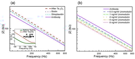 Measurement results showing absolute impedance for layer formations on IDE: (a) before and after Ta2O5 layer with the equivalent circuit (inset) followed by biotin, streptavidin and antibody layers, and (b) uromodulin concentrations in artificial urine.