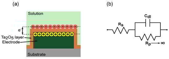 The Ta2O5 passivated electrode shows capacitive behavior as compared to before passivation, which is due to the permittivity and thickness of the Ta2O5 layer (Figure 3a (inset)). The impedance spectroscopy measurement results are fitted to an equivalent circuit with a series resistor (), which is the sum of the solution resistance and polarization resistance, the interface capacitance effect as a double-layer capacitor (Cdl) and the polarization/charge transfer resistance () at the electrode–electrolyte interface in parallel to Cdl. The passivated electrode prevents the transfer of charges at the electrode–electrolyte interface (Figure 4).