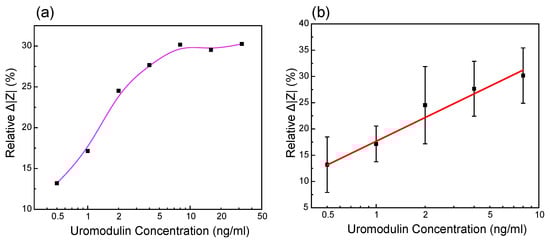 Measurement results of the relative change in impedance values of uromodulin in artificial urine at the frequency of 150 Hz of different IDE against different uromodulin concentrations in (a) dynamic range 0.5 ng/mL–32 ng/mL and (b) linear fitting of values in range 0.5 ng/mL–8 ng/mL (n = 3, relative = log [uromodulin concentration], R2 = 0.976).