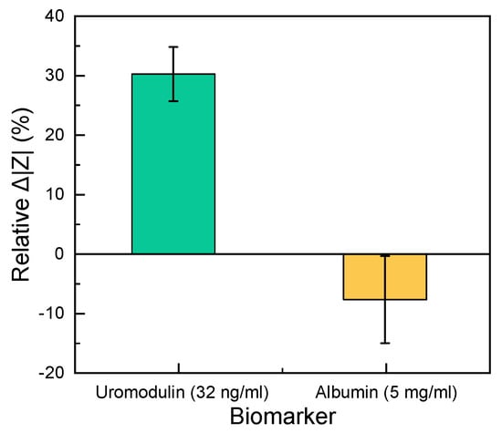 Under the normal functioning of the kidneys, a high concentration of uromodulin is present in the urine (30–180 µg/mL). When the kidney function is reduced, the uromodulin concentration in the urine decreases. This situation is the opposite to that observed in the case of albumin. Albumin is a conventional biomarker for kidney damage, which could be a source of interference for the proposed uromodulin sensor. Under the normal functioning of the kidneys, albumin should not be present in the urine (<30 µg/mL). We observed the influence of albumin on the impedance by employing a clinically relevant albumin concentration (5 mg/mL) and compared the response with a uromodulin control sample (32 ng/mL) on different sensors. The relative change in impedance for uromodulin was 30 times higher than that of albumin from a blank measurement at 150 Hz (Figure 6). For the given point-of-care application, this difference in impedance change would be sufficient to distinguish between normal and abnormal kidney function.