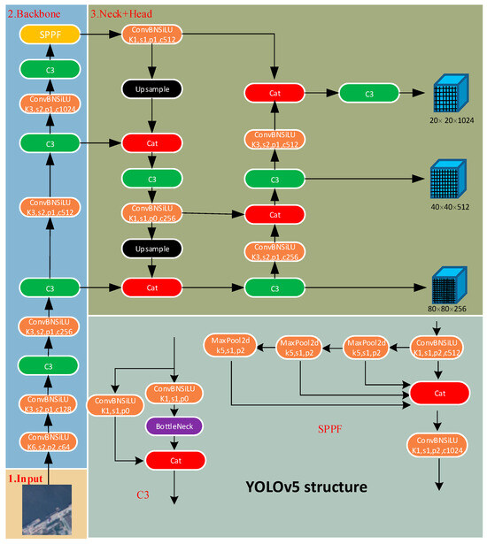 YOLOv5 [18] is a popular object detection algorithm that is improved and optimized based on YOLOv4 [19]. The principle of YOLOv5 is based on the idea called “You Only Look Once” (YOLO), which treats object detection as a regression problem and predicts bounding boxes and class labels simultaneously in a single neural network, as shown in Figure 1. Compared to traditional two-stage detectors like Faster R-CNN [20], YOLOv5 adopts a simpler and more direct approach, striking a better balance between speed and accuracy. YOLOv5 introduces new data augmentation strategies such as Auto Augment and Multi-Scale Training. These strategies increase the diversity of training data, improving the model’s robustness and generalization capability. YOLOv5 adapts to different application scenarios and hardware requirements by introducing model variants of different scales, such as YOLOv5s, YOLOv5m, YOLOv5l, and YOLOv5x. This scaling approach allows users to flexibly choose models according to their specific needs, balancing speed and accuracy.