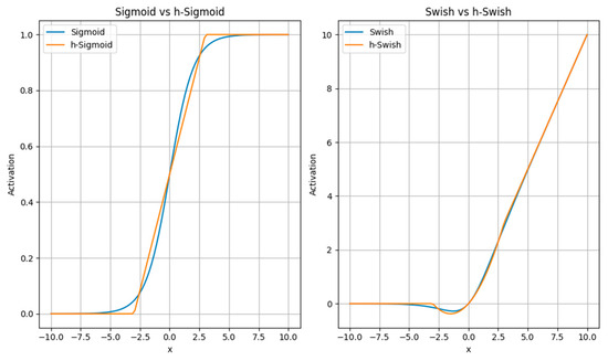 Replacing the sigmoid function in the swish activation function with the function not only results in a similar shape to the swish function, as shown in Figure 2, but also improves inference speed and facilitates the quantization process.