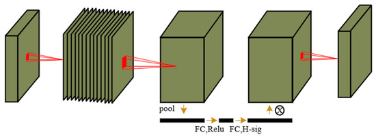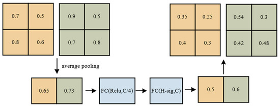 In addition, the Squeeze-and-Excitation (SE) [29] module is used for channel-wise attention weighting of feature maps. The SE module learns the importance weights of each channel in the feature map through global average pooling and two fully connected layers, and applies them to each spatial position in the feature map. This enhances the network’s sensitivity to different channels and further improves the representation capability of features, as shown in Figure 4.