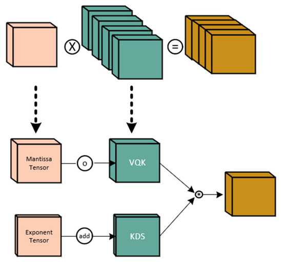The specific structure of it consists of two key components: Variable Quantization Kernel (VQK) and Kernel Distribution Shifting (KDS), as shown in Figure 6. VQK is an integer tensor of the same size as the original weight tensor, represented in 2’s complement format, with its range determined by a preselected number of bits. KDS is a floating-point tensor used to store the scaling factors for each block. By multiplying the integer values of weights and activations with their respective scaling factors, the distribution of each block is readjusted to the correct range. It also employs an activation quantization method called Block Floating-Point (BFP). It partitions the activation tensor into blocks and performs clipping and shifting on other activations based on the maximum exponent within each block. This allows the use of fewer bits in the activation tensor and enables low-precision integer operations between weights and activations.