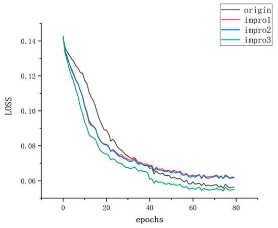 The bounding box loss is measured using the Smooth L1 loss, which evaluates the model’s accurate prediction of bounding box positions. The class loss uses the cross-entropy loss function to measure the model’s accurate prediction of target classes. The object presence loss encourages the model to make accurate predictions regarding the presence of objects using binary cross-entropy loss, while the object absence loss utilizes the negative log-likelihood loss function to reduce false positives. By simultaneously optimizing these loss functions, the YOLOv5 model can achieve accurate object detection, accurately predicting bounding box positions, target classes, and object presence. The weights of the loss functions can be adjusted based on the requirements of the task to balance the contributions of different losses, thereby improving the model’s performance and robustness. With the parameter settings and loss optimization mentioned above, the training of the model before and after improvement on the same dataset resulted in the relationship between loss and epochs as shown in Figure 8.