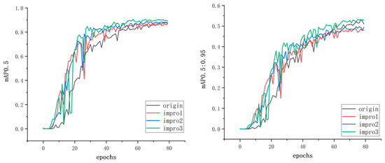 By plotting the curves of mAP0.5 and mAP0.5:0.95 metrics, the impact of the improvement on the model’s performance can be clearly demonstrated, as shown in Figure 9.