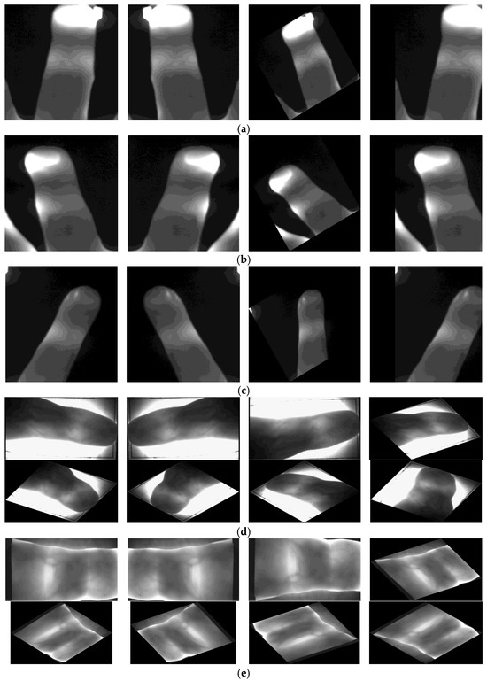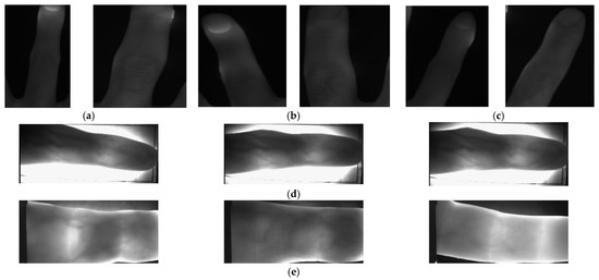 In this acquired database [31], images for 156 subjects are available. For subject numbers 1–105, there are 24 images per subject, whereas for subject numbers 106–156, there are 12 images per subject, which were duplicated to obtain 24 images per subject. This database was preprocessed further to have the desired images fed into our classification algorithms. Three sample images for the fingers are shown in Figure 2d.