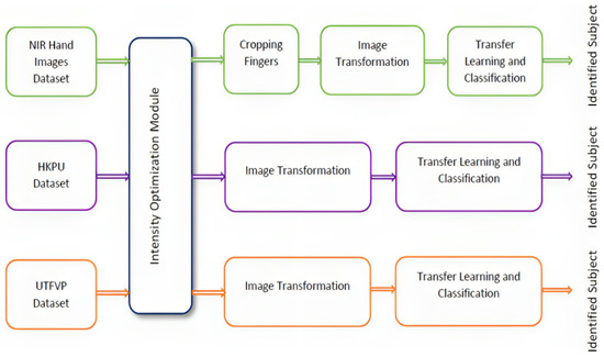 In this work, the NIR Hand Images database was used [3]. To perform a comparative analysis, we acquired two publicly available databases, the HKPU Finger Vein images database [31] and the UTFVP database [32,33], collected from Hong Kong Polytechnic University and the University of Twente Netherlands, respectively. Figure 1 shows a block diagram of the proposed system.