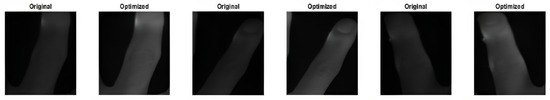 The optimization is achieved by examining the overall intensity level of image pixels and, depending upon it, increasing or decreasing the intensity of each pixel by employing intensity scaling. Therefore, all three employed databases [3,31,32,33] were preprocessed through coding in MATLAB to achieve smoothened and intensity-optimized finger images, as displayed in Figure 7.