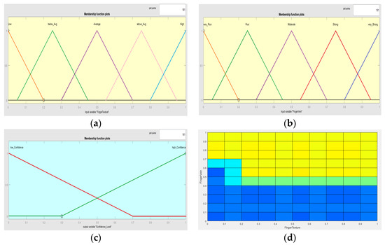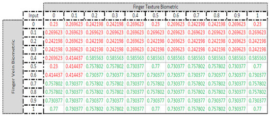 Figure 10 shows the output of the Fuzzy Inference System in grid form. The confidence values for individual biometric modalities from 0 to 1 were applied as input, and the observed output is listed. A green font color is used for output confidence values above 0.5, whereas below 0.5, output confidence values have a red font color. It is evident that, when the Finger Vein confidence value was above 0.6 for some candidate image to be classified as a member of a particular subject class, the decision of the Finger Texture confidence value did not affect the overall identification result. On the other hand, if the confidence value for the Finger Vein biometric fell below 0.3 for a candidate image to be classified as not a member of a particular subject class, then the Finger Texture confidence value did not affect the overall identification result.